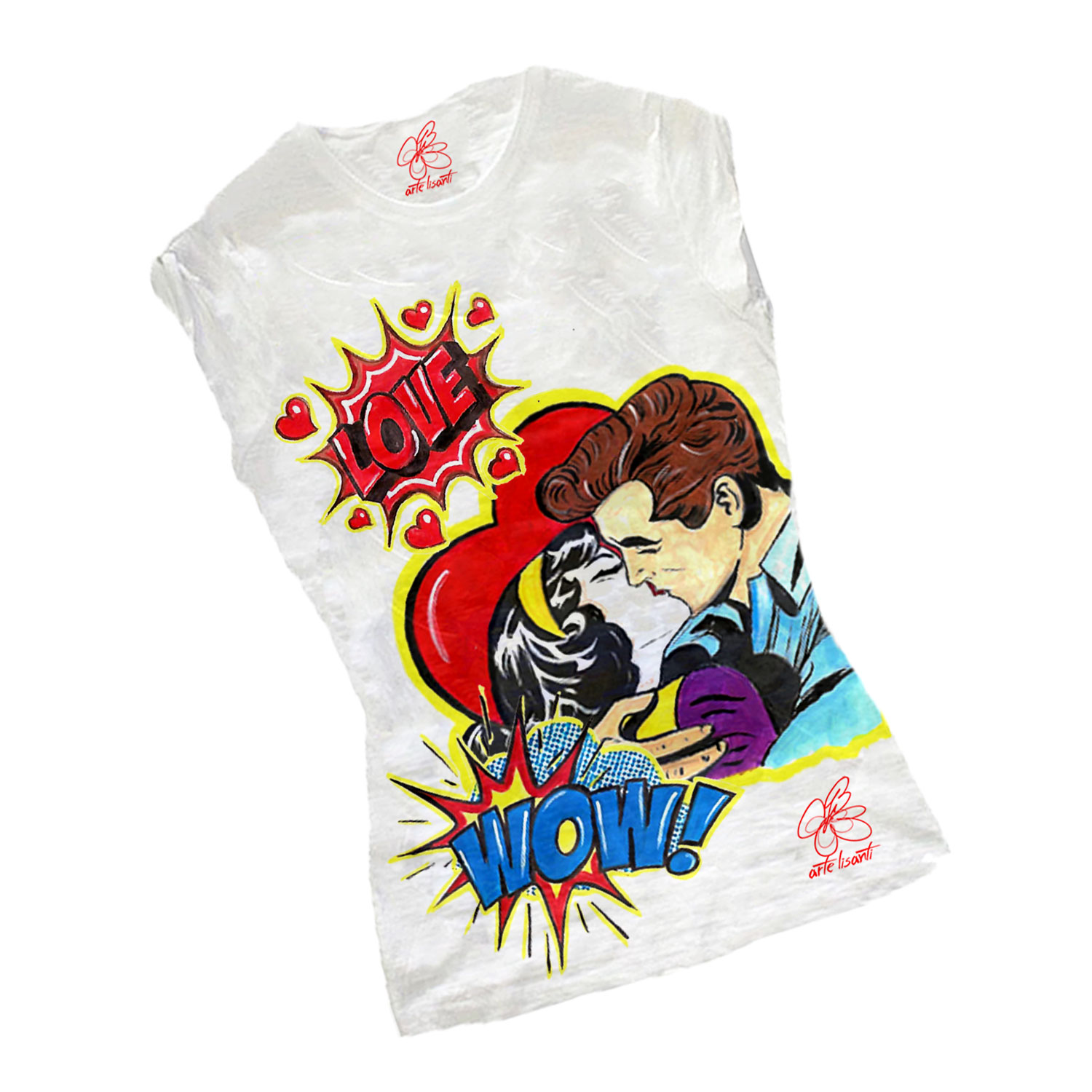 T-shirt dipinta a mano – Love, omaggio a Roy Lichtenstein: Si omaggia il mondo dei fumetti che entrò a far parte della Pop Art grazie a Lichtenstein, con i suoi colori brillanti e le tipiche scritte che enfatizzano i suoni. Il tema è l’amore sottolineato da un bacio appassionato e dai cuori.