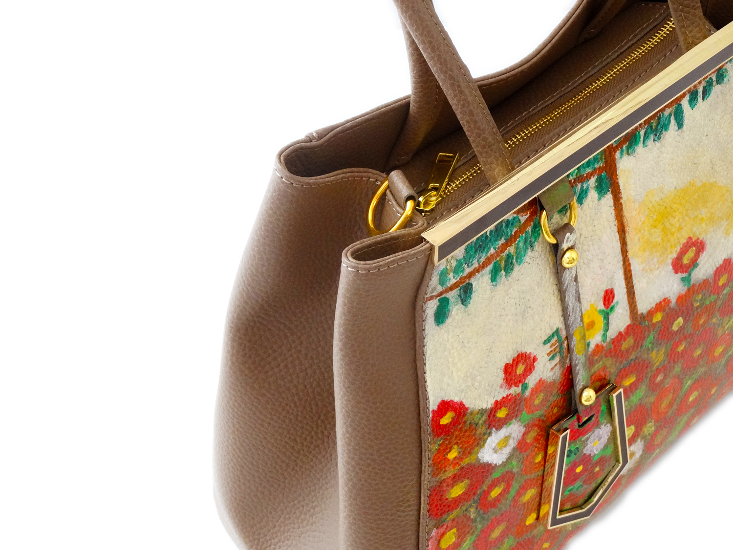 Borsa dipinta a mano – Campo di fiori di Schiele: Dipinto insolitamente luminoso per l’esponente assoluto del primo espressionismo viennese, ArteLisanti ne coglie la dolcezza e lo reinterpreta con colori luminosi e leggere sfumature dorate, le varie gradazioni di rosso spiccano per donare outfit all’insegna del colore e dell’arte.
