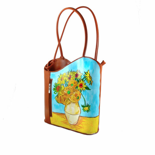Borsa dipinta a mano – I girasoli di Van Gogh: I Girasoli sono il soggetto che più di ogni altro è legato al nome di Van Gogh. Il Giallo, Ocra, Marrone e Arancione di questo dipinto ben si armonizzano alla base della borsa artigianale completamente realizzata in Italia; per avere il vaso di fiori più famoso della storia dell’arte sempre con voi.