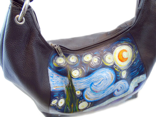 Borsa dipinta a mano – Notte stellata di Van Gogh: La veduta notturna più famosa della storia dell’arte riprodotta su un fantastica borsa in pelle. Il Quadro dal forte impatto emotivo è reso attuale con colori brillanti e splendenti che ne esaltano il pathos.