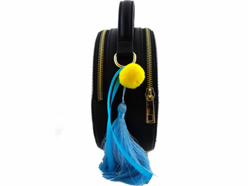 Borsa dipinta a mano – Tamburello Maioliche di Sicilia: Una splendida borsetta in pelle a forma di tamburello siciliano con dipinta una mattonella delle caratteristiche maioliche siciliane. Borsetta dipinta a tracolla artigianale Made in Italy.