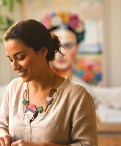 Collana dipinta a mano – Ispirato a Frida Kahlo : Un omaggio colorato e romantico alla pittrice messicana Frida. Il pendente in legno, dipinto a mano con fiori e cuore, racchiude la forza e la passione dell’artista. Leggera, elegante e vivace, è perfetta per aggiungere un tocco d’arte e personalità a ogni look o come idea regalo speciale.