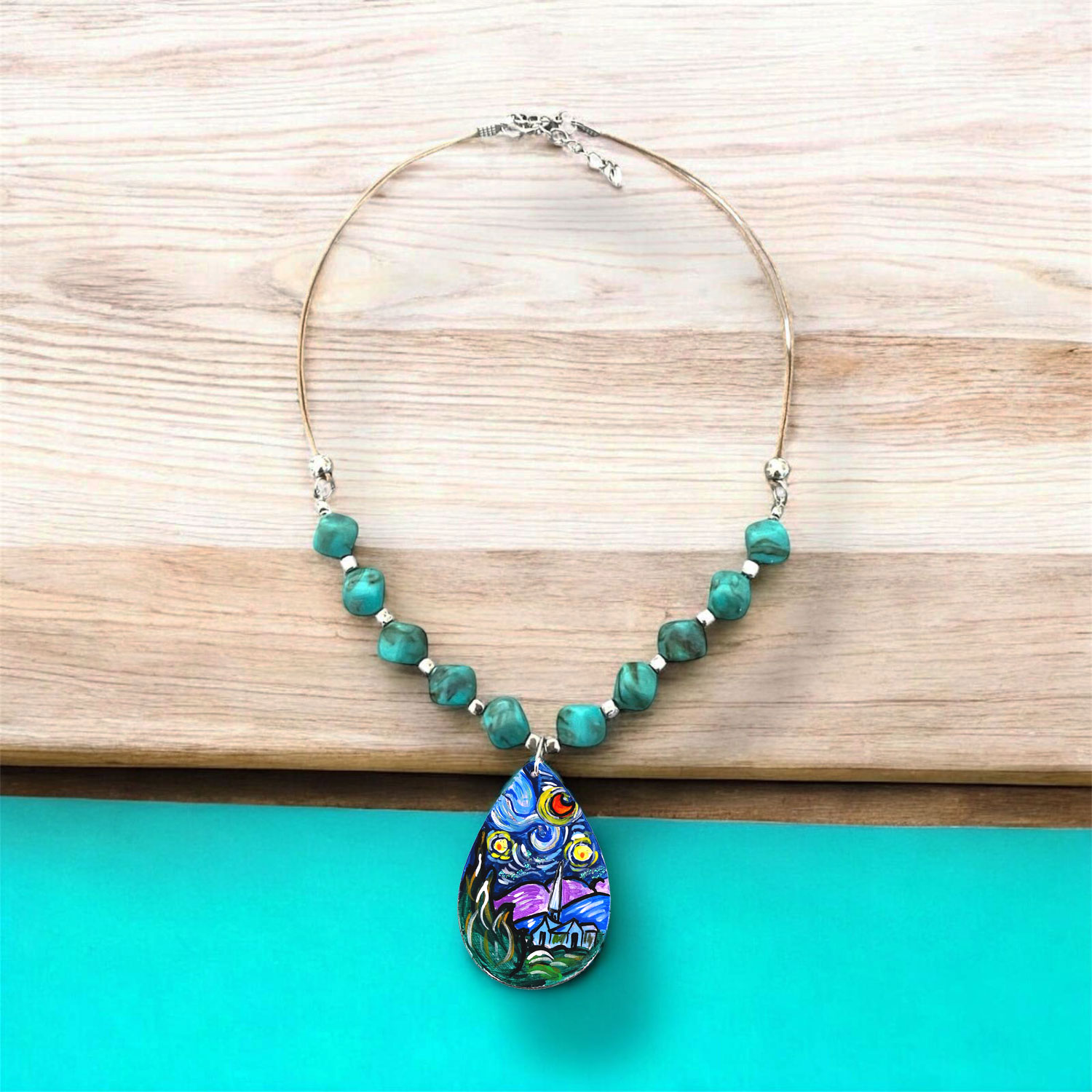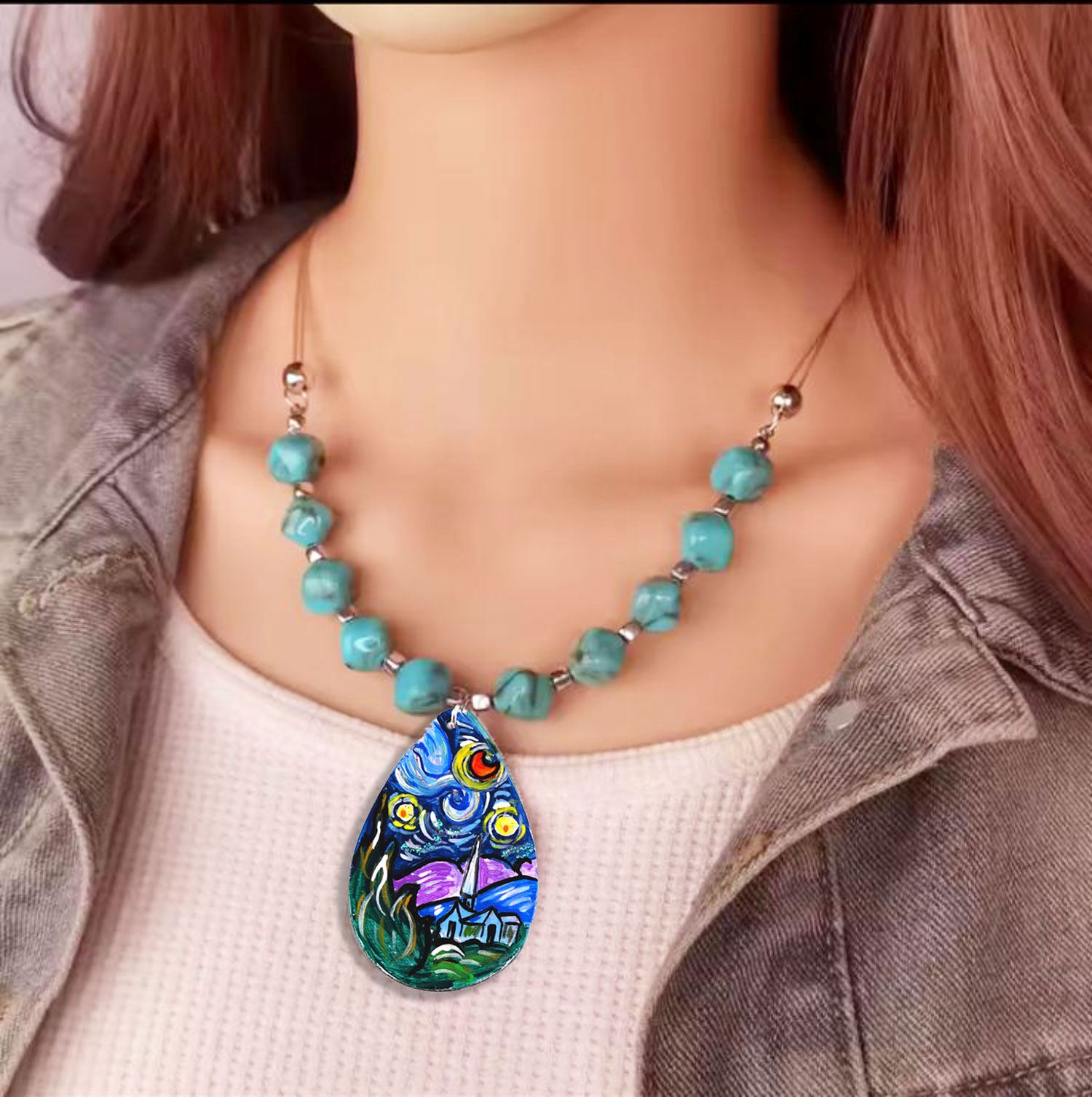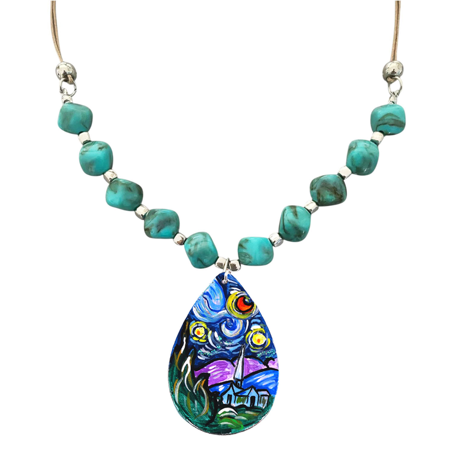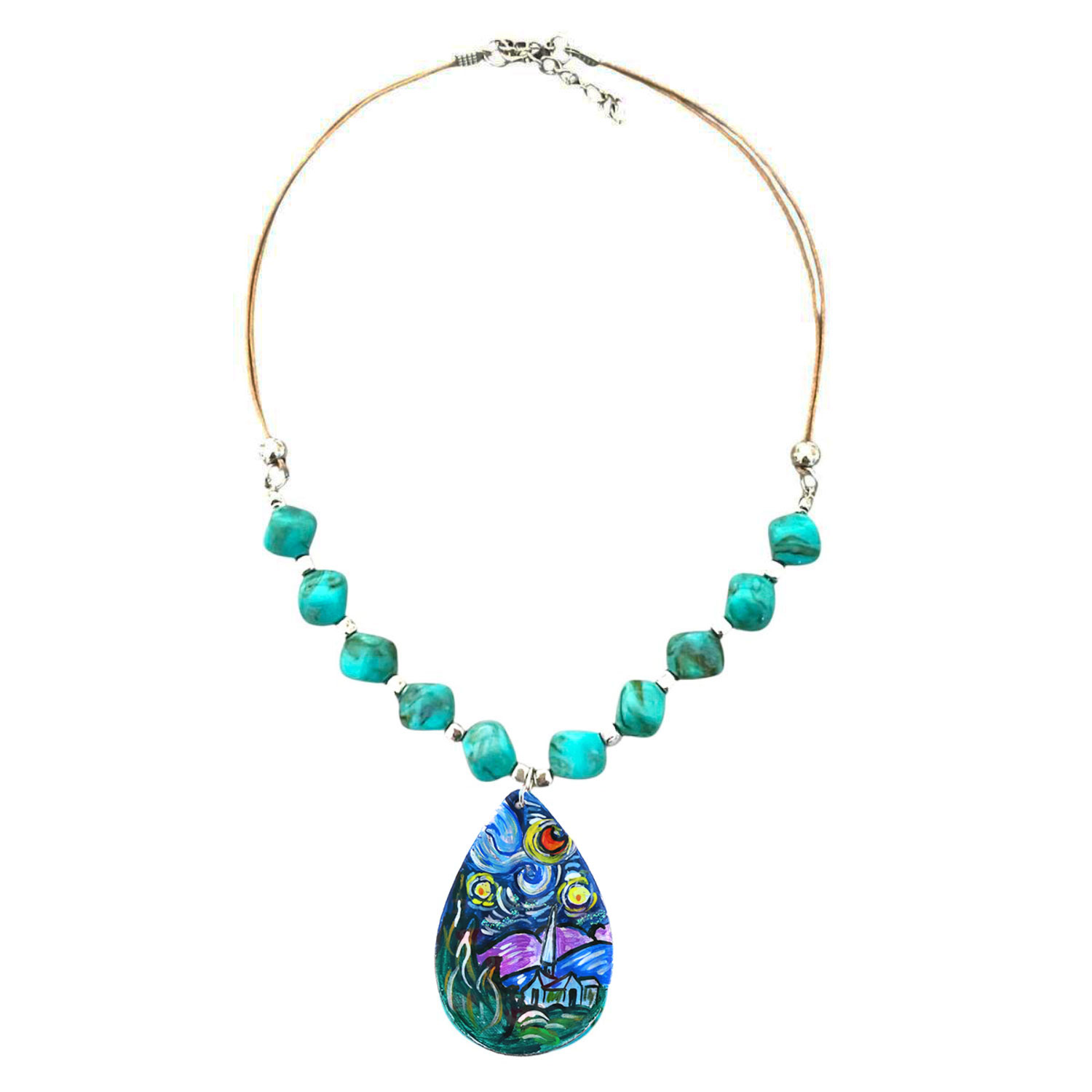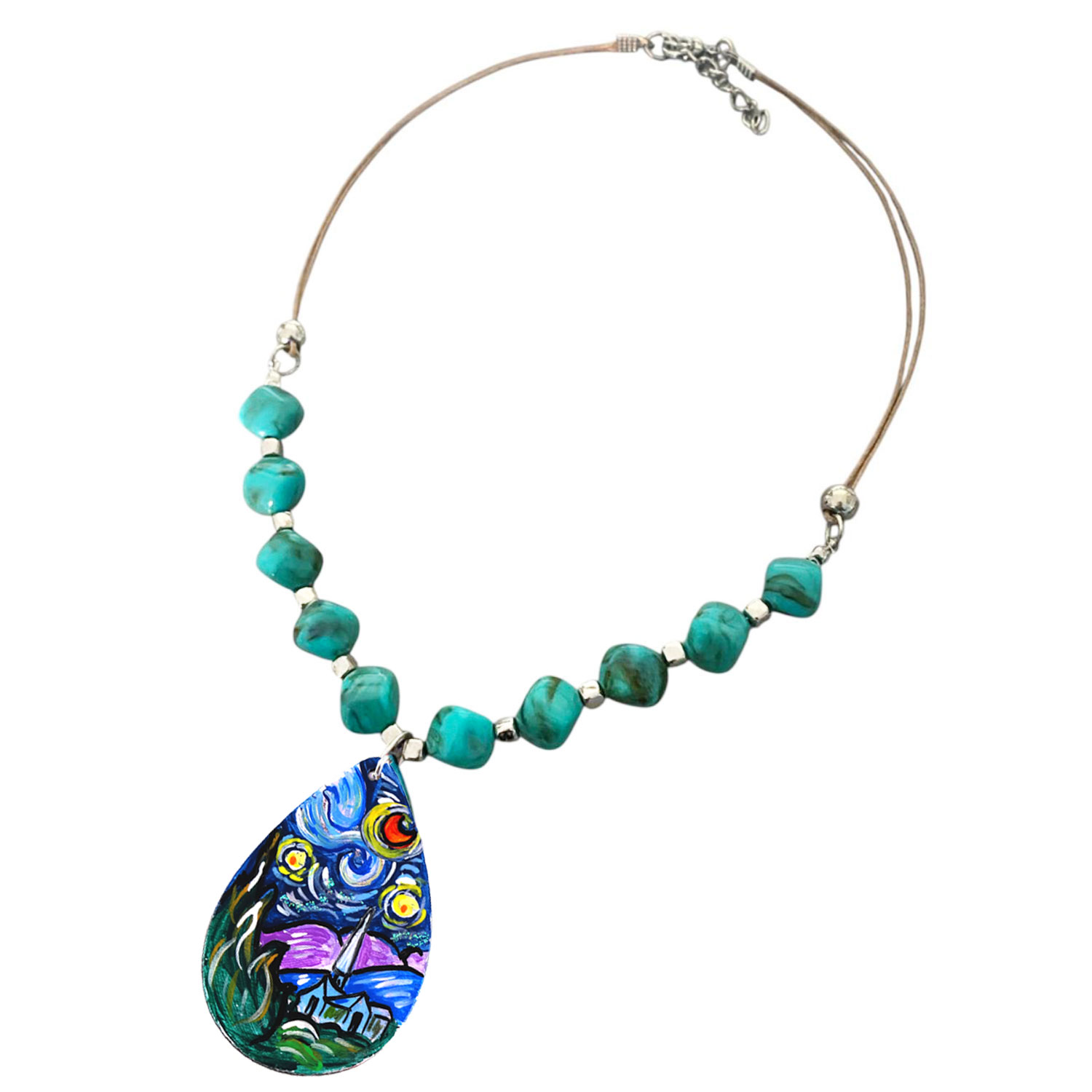 Collana dipinta a mano – La notte Stellata di Van Gogh: Un raffinato omaggio all’arte senza tempo, il ciondolo dipinto a mano raffigura la Notte Stellata di Van Gogh, impreziosito da un cordino cerato e perle in resina turchese effetto marmo che riprendono i colori del dipinto. Un gioiello luminoso e suggestivo, pensato per chi ama indossare l’arte.