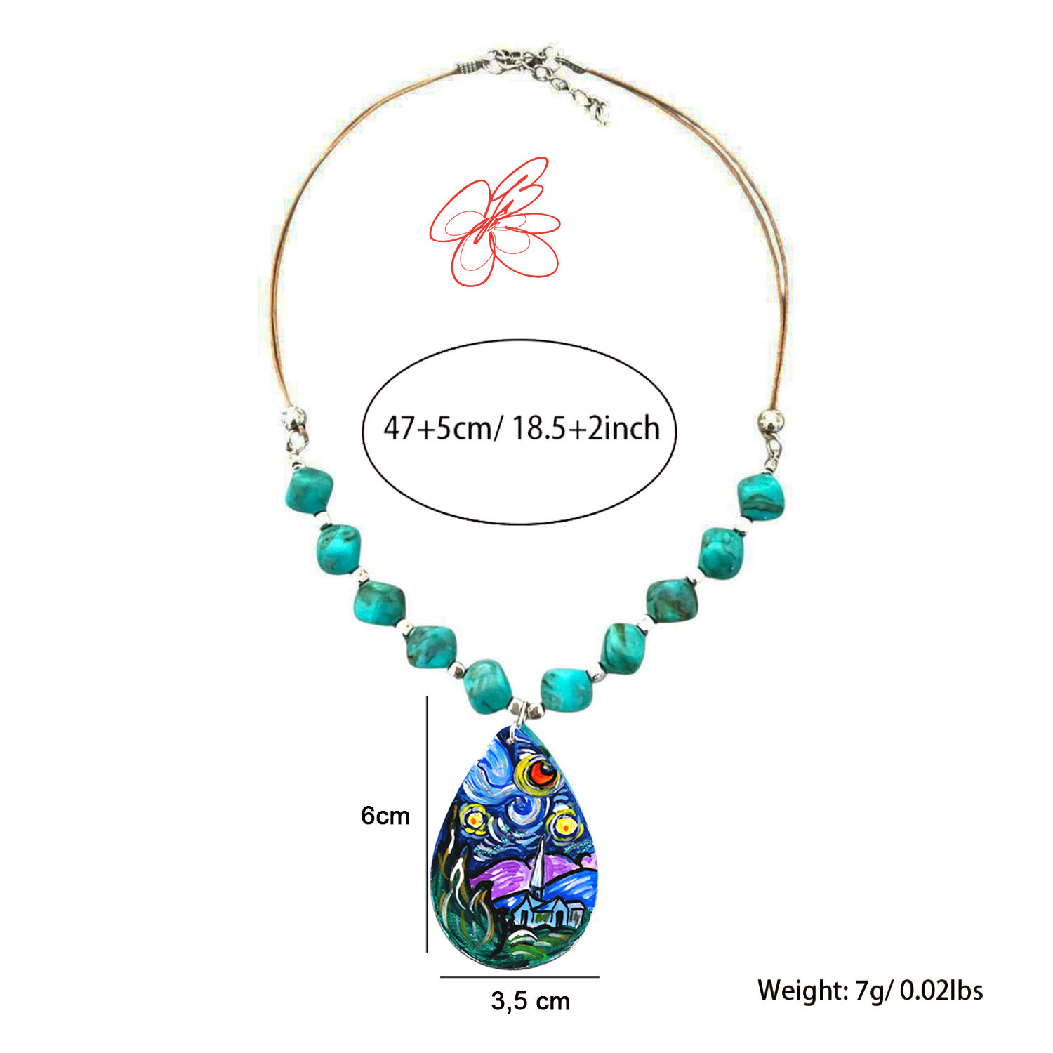 - Dimensioni: Collana lunga 47 cm più 5 cm di catenella regolabile, ciondolo a goccia di 6×3,5 cm