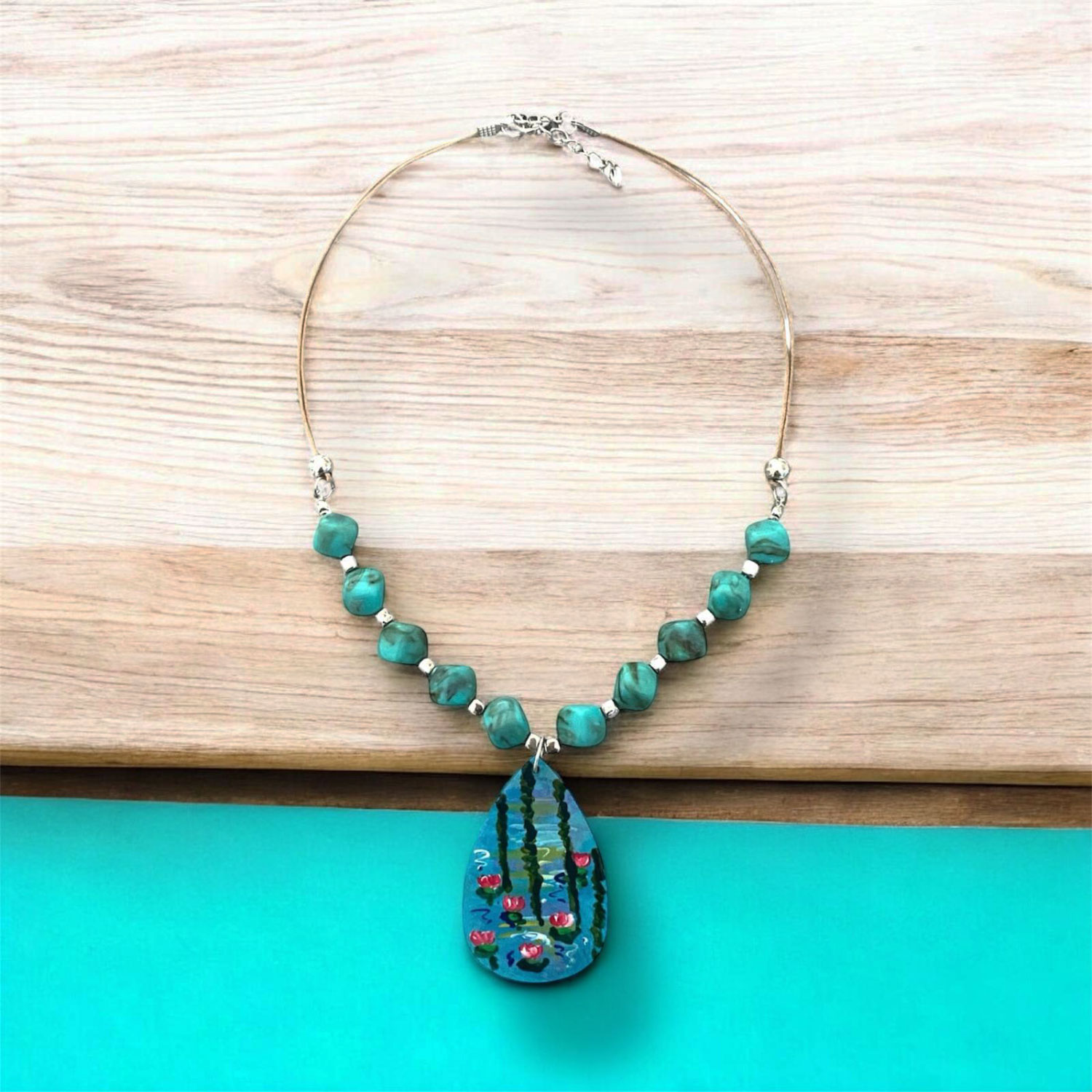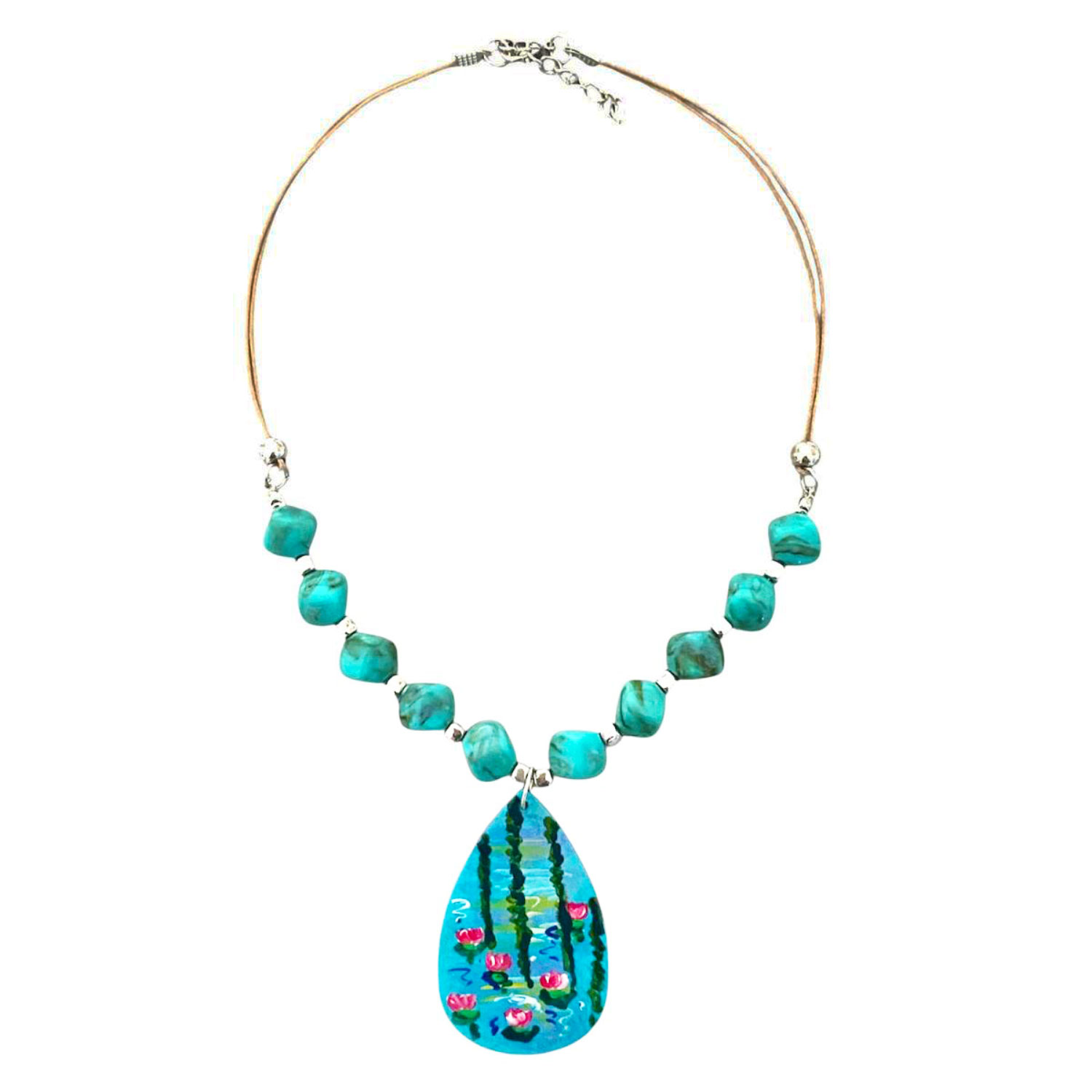 Collana dipinta a mano – Stagno di ninfee e salice di Monet: Un raffinato omaggio all’impressionismo francese, il ciondolo dipinto a mano raffigura le Ninfee e il Salice di Monet, accompagnato da un cordino cerato e perle in resina turchese effetto marmo che ne riprendono i colori. Un gioiello elegante e luminoso, perfetto per chi ama l’arte di Monet