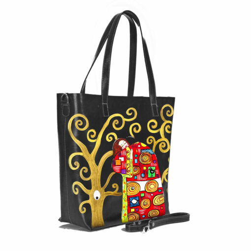 Borsa dipinta a mano – L’ abbraccio di Klimt: Dettaglio del trittico Albero della vita, dettagli unici enfatizzati dal fantastico oro su sfondo nero, borsa shopper molto ampia.
