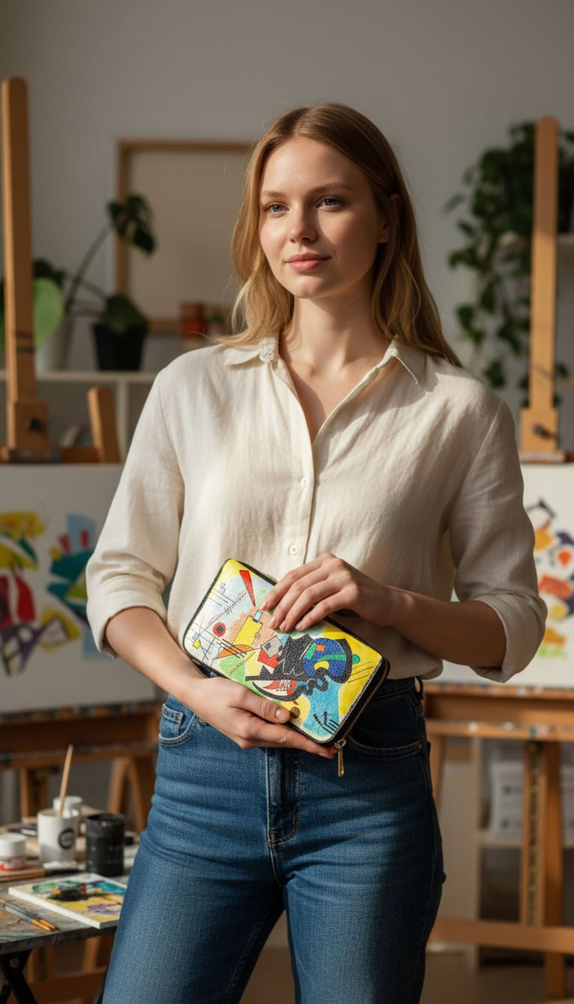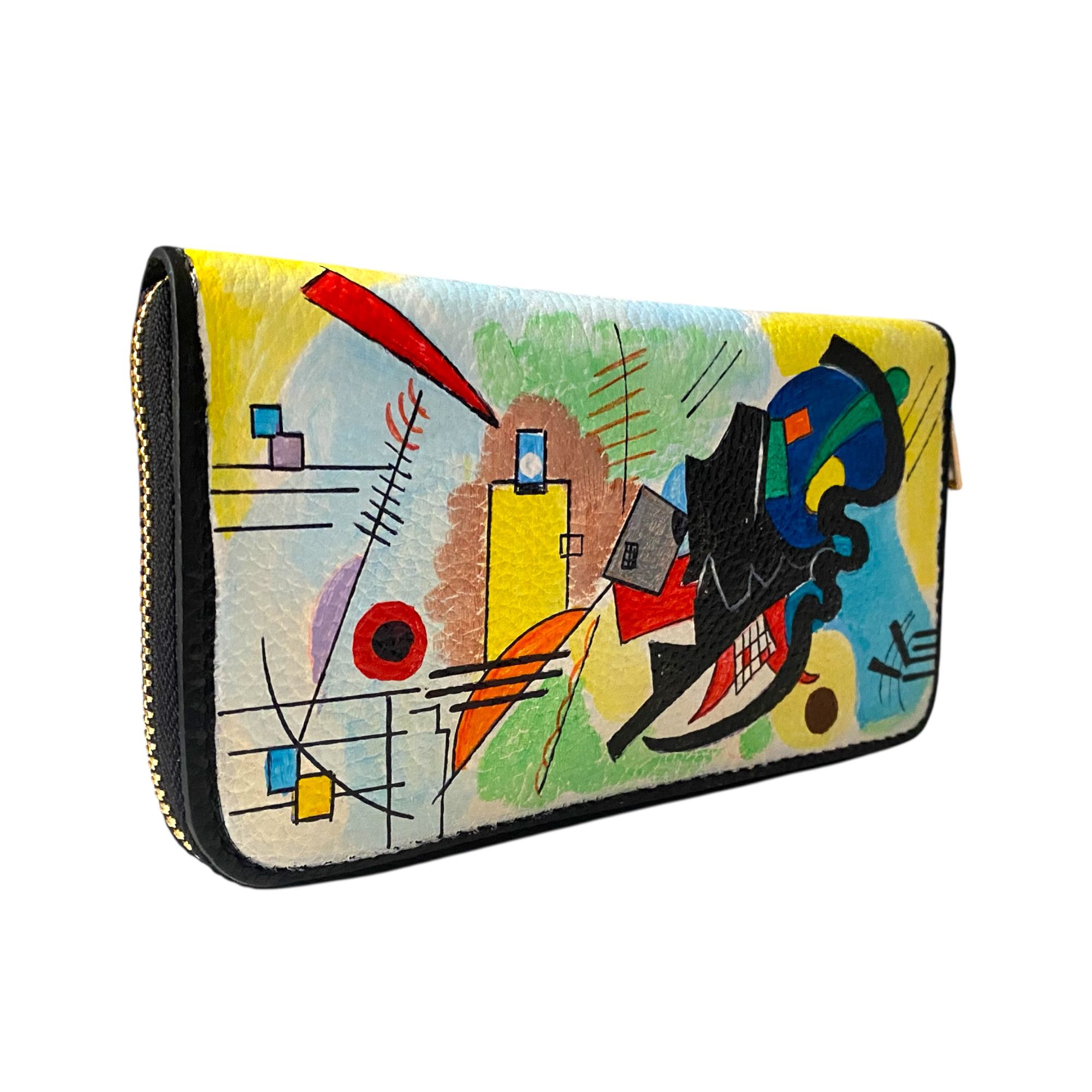 Portafoglio in pelle dipinto a mano – Blu, giallo, rosso di Kandinskij: Forme geometriche, colori e ritmi soprattutto diagonali toni dal blu, rosso, giallo, in diverse gradazioni e sfumature. …è l’astrattismo di Kandinskij su un portafogli di manifattura artigianale.