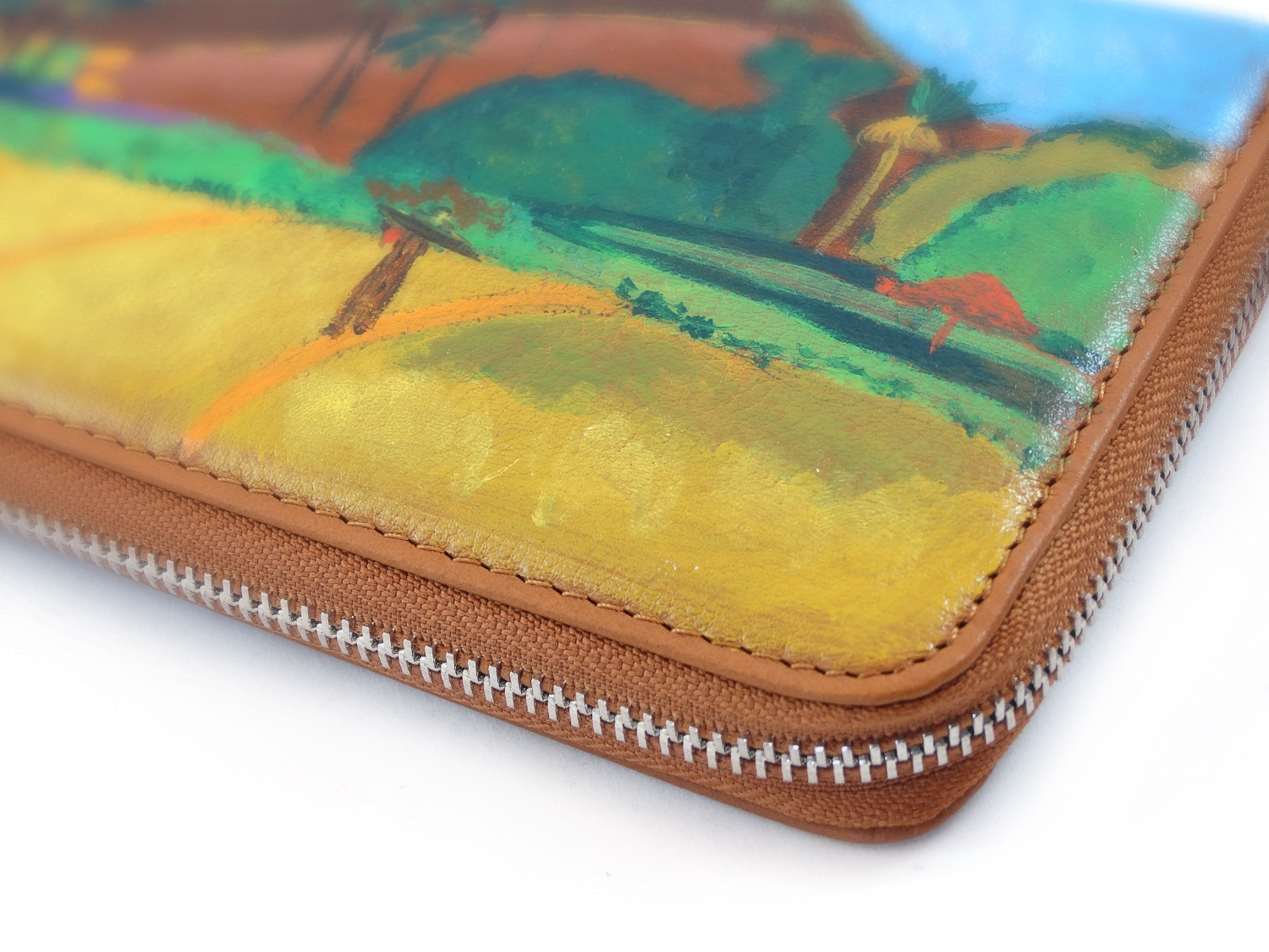 Portafoglio dipinto a mano – Paesaggio Tahitiano di Gauguin: Uno dei tanti paesaggi di Tahiti luogo che Gauguin amò nel corso della sua vita con i suoi colori caldi e le sue immagini rurali.