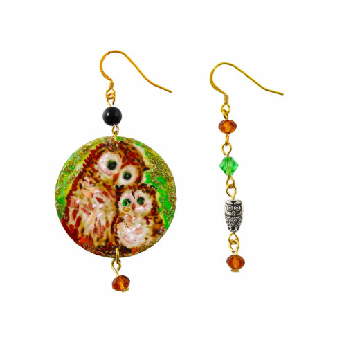 Orecchini dipinti a mano – Tenere civettuole: Tenere civette colorate e divertenti su questi splendidi orecchini artigianali dipinti a mano. Versione asimmetrica.