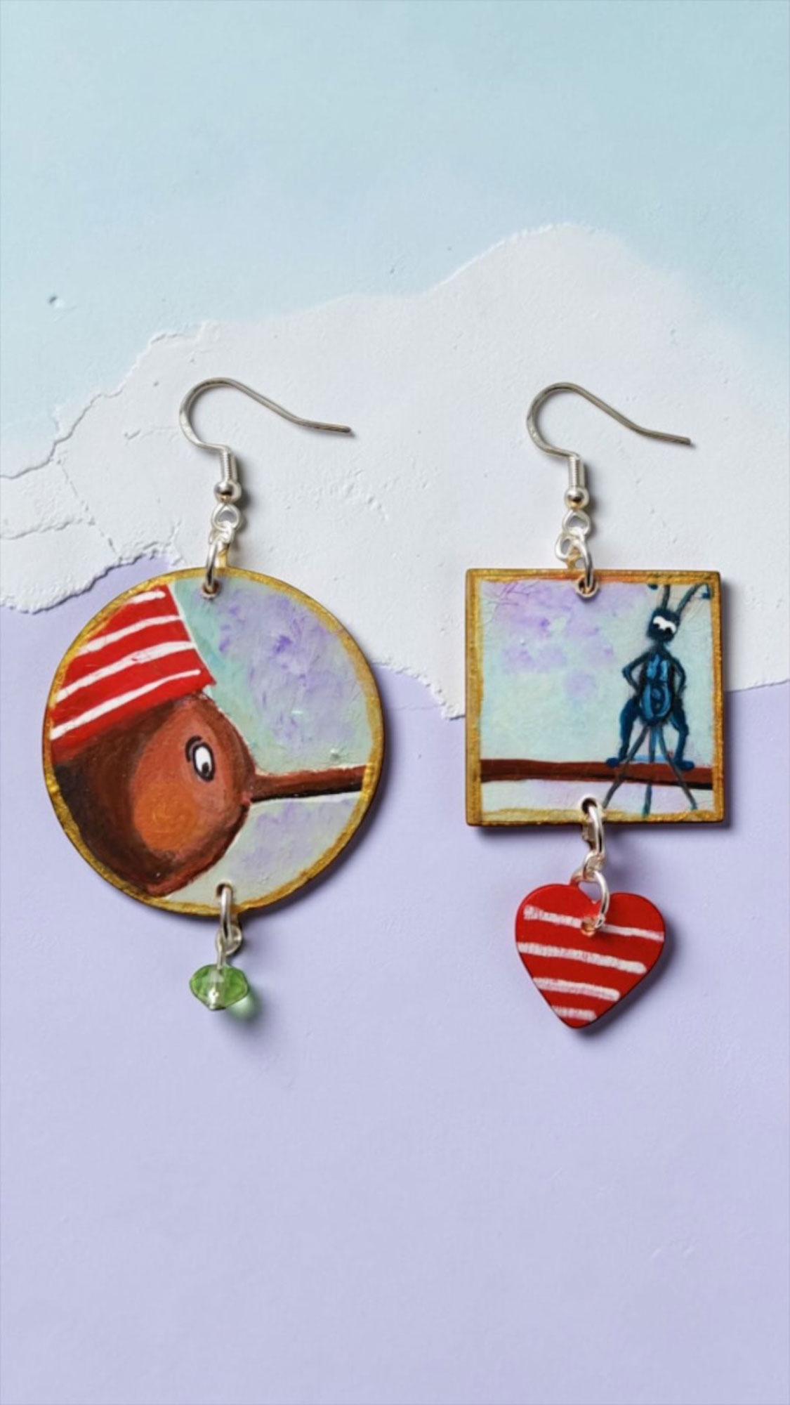 Orecchini dipinti a mano – Pinocchio omaggio a Collodi: Lasciati incantare da questi meravigliosi orecchini asimmetrici ispirati alla magica storia di Pinocchio. Ogni pezzo è un’opera d’arte dipinta a mano da ARTELISANTI, che cattura l’essenza di questa amata favola italiana. Il primo orecchino, di forma rotonda con 4 cm di diametro, raffigura il celebre burattino, mentre il secondo, quadrato di 3×3 cm, presenta il naso con il grillo parlante in una composizione giocosa. L’asimmetria crea un dinamismo unico, impreziosito da un charm a forma di cuore in legno rosso e una brillante pietra in vetro. Le monachelle in argento nichel free garantiscono comfort e sicurezza. Questi orecchini originali e spiritosi sono perfetti per chi ama distinguersi con accessori che raccontano storie. Ogni paio è unico, realizzato con cura artigianale per trasformare un classico della letteratura in un accessorio contemporaneo e distintivo.